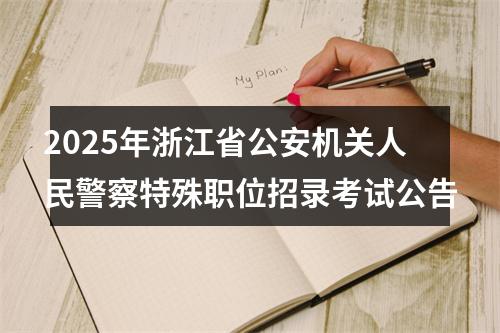 为进一步加强浙江省公安机关队伍建设,根据公务员法和《浙江省公务员录用实施办法》等有关规定,浙江省公务员局、浙江省公安厅决定组织开展2025年浙江省公安机关人民警察特殊职位招录工作。现将有关事项公告如下。