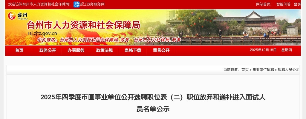 【2025年四季度台州市直事业单位选聘(二)放弃和递补进入面试名单公示】相关岗位: